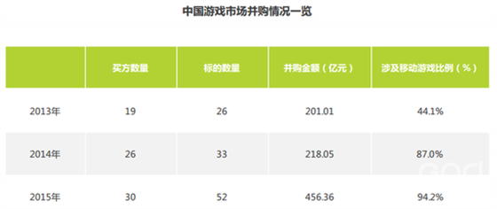 根据艾瑞咨询发布的《2016年中国移动游戏行业研究报告》,移动游戏领域的并购已经连续3年高速增长,2015年中国游戏并购规模超过450亿,是2014年的2倍,其中94.2%涉及移动游戏。