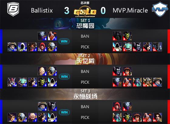 相比火药味十足的败者组决赛,总决赛的这场BO5对抗几乎可以认为是胜者组决赛的重演。尽管没能再次拿出蛛后墓上那样令人眼前一亮的阵容,Ballistix还是用他们默契的配合再次击败MVP.Miracle,夺得了本次黄金世俱杯的冠军。