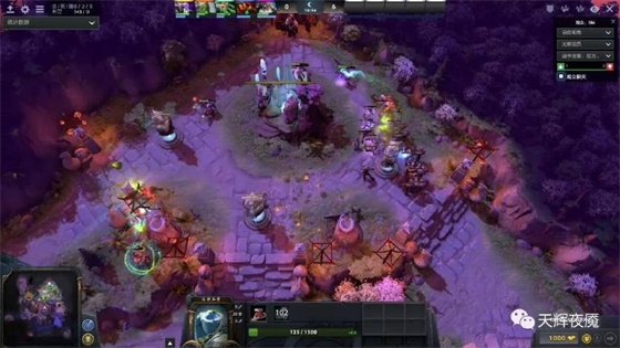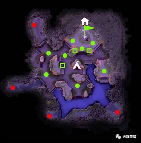 我方建筑:血泉(绿色小旗),防御塔(绿色圆球)和圣坛(绿色方框)三种,高地上有3个塔两个圣坛,剩下的都在外面