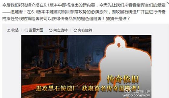 根据上周暴雪公布的2015年计划,玩家将在6.1版本中获得一位传说级随从(2015年计划详情),但暴雪对追随者的具体资料守口如瓶,此次官方微博发布截图,是首次针对6.1的内容进行详细的说明,根据微博来看,6.1的其他游戏内容也会在近期放出,尽请关注。