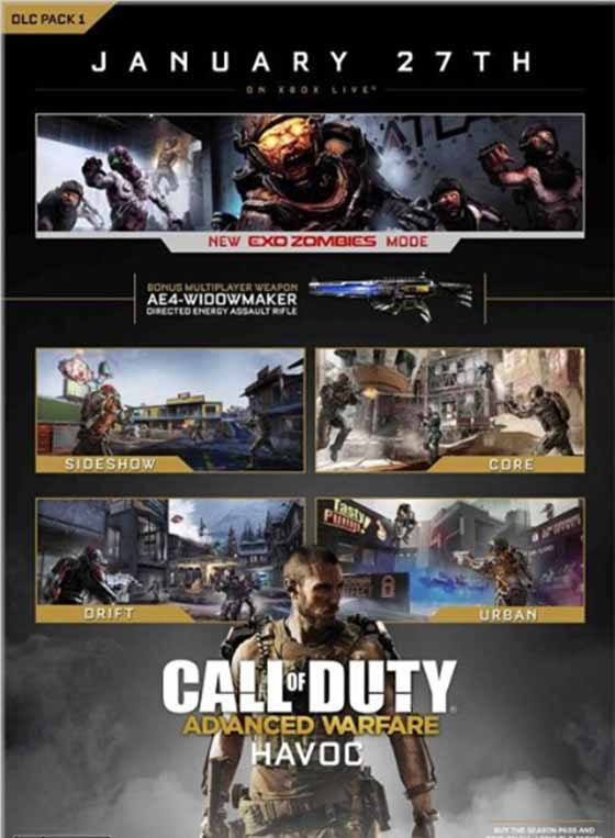 《COD:高级战争》的开发组大锤在他们的推特上公开了游戏第一弹DLC的发售日期为2015年1月27日。本次的DLC被命名为“Havoc”,内含4张全新多人对战地图,一把可以用在多人模式中的全新武器AE4 Widowmaker(寡妇制造者)。除此以外最重要的是,本次DLC终于为游戏带来了大家期待已久的丧尸模式,当然本作中叫做“EXO外骨骼丧尸模式”,相较于之前作品中的敌人,本作的丧尸有了EXO外骨骼的帮助相信机动能力更强,那么势必要对游戏的玩法作出改进,这也是让玩家期待的理由之一。