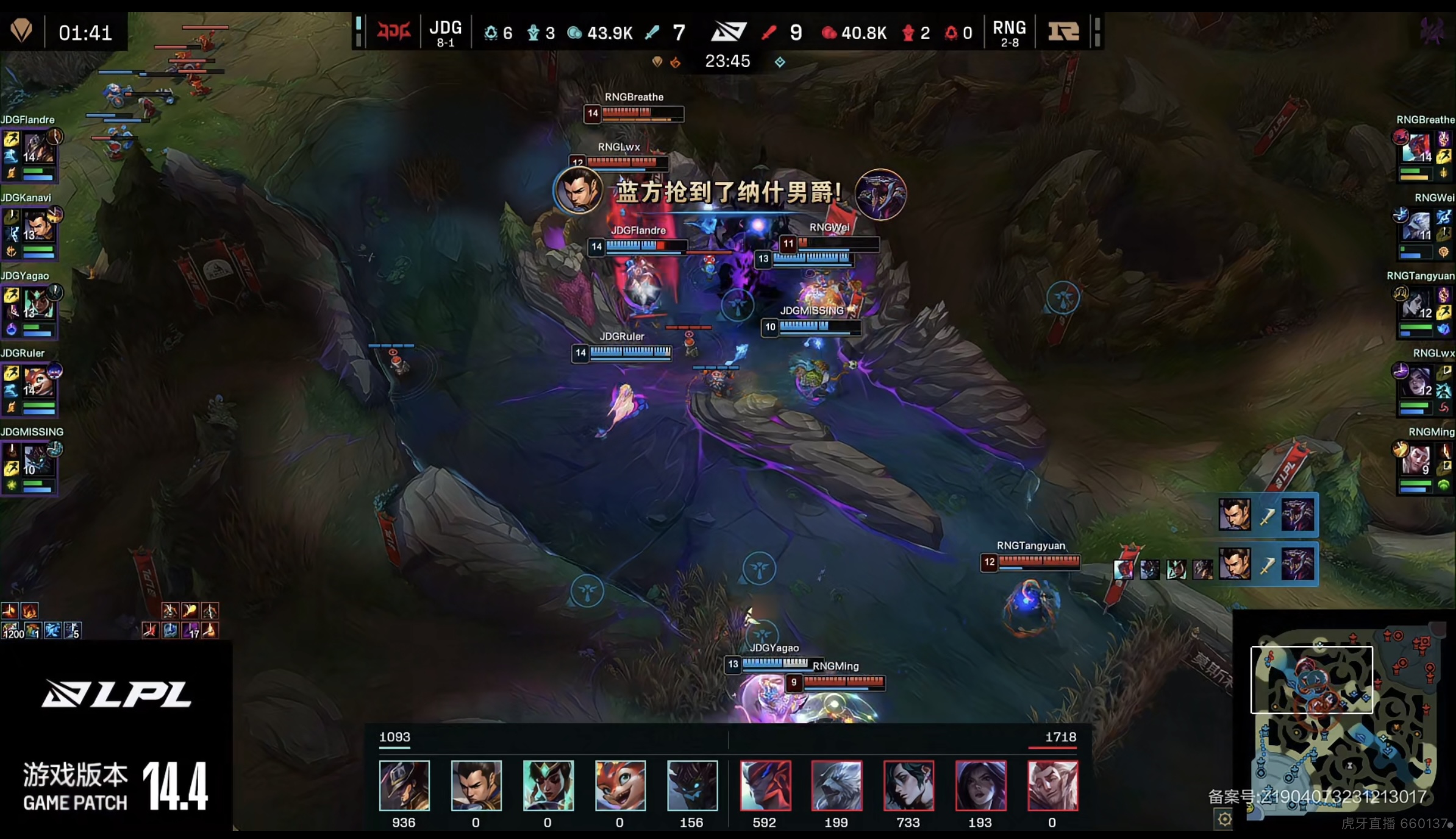 中期JDG的团战拉扯与输出,将RNG慢慢拉扯致死,接手RNG的小龙,Kanavi赵信又在RNG手中抢下大龙。此时JDG士气正盛将RNG团灭,推掉RNG中路高地。