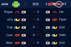 另一场比赛JinAir 3比2险胜KT。教主Flash继续IEM9的颓势,输给sOs,新科GSL冠军Life居然也输给Rogue。不过凭借Zest和Stats的胜利,KT还是把比赛拖入大将战。遗憾的是大将战中IEM9世界冠军Zest输给Maru,KT只能吞下失败的苦果。