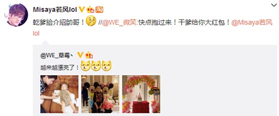 很快,草莓微博得到微笑和若风的转发,两人均自称自己为草莓女儿的干爹。