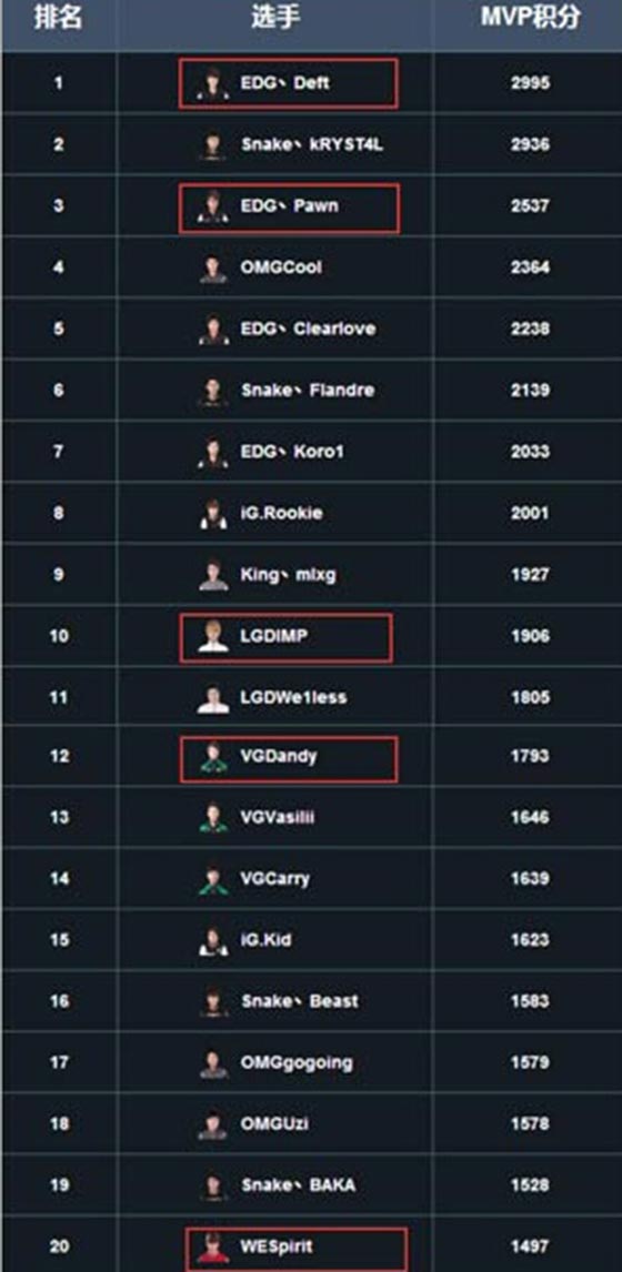 他们的加入不仅为战队注入了新鲜血液,使战队焕然一新,在个人方面也取得了不俗的表现。在LPL常规赛的MVP数据榜上,也能看到他们的身影名列前茅。
