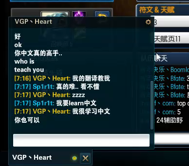 据Heart在直播中和Spirit用中文聊天时说,他的中文是队内翻译教他的: