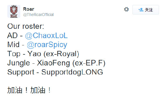 近日,一支名叫Roar的战队正式宣布成为最近传闻说Chaox又组的新队,准备征战中国赛事,他们正准备参加下一届的TGA大奖赛。根据外国的来源,这支队伍里的其他队员有不少多是中国的职业队员,其中最引人注目的便是上单“姚帝”。而以前的美女辅助Yuno则不在阵容名单上。