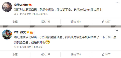 在昨日中午时分,微笑、55开(white)同时发微博称“我真的帅”,让小编无语,也倾倒了无数粉丝:你俩的节操呢?