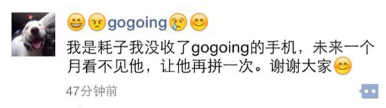 在大哥gogoing的朋友圈,却出现一条并不是他本人发的东西:“我是耗子,我没收了gogoing的手机,未来一个月看不见他,让他再拼一次,谢谢大家。”