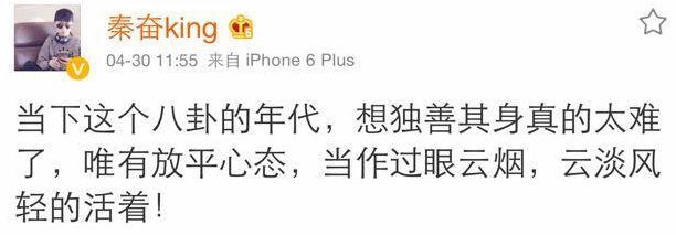 而后,秦奋发微博表示:当下这个八卦的年代,想独善其身真的太难了,唯有放平心态,当作过眼云烟,云淡风轻的活着!