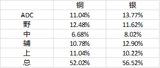 跟后面高段位比较过以后就会发现青铜组的特殊之处:专业中单玩家在冲分路上并不具有优势,如果考虑到小号代打都是以中单为主,实际上普通玩家里主玩adc和辅助的上分比例更高。这一方面是因为青铜比赛节奏特别慢,使得下路双煞有机会在拖到40分钟后决定比赛结果;另一方面也因为adc和辅助在当前版本不受玩家欢迎,而青铜组的bp又尤其鬼畜,专业adc和辅助一方面容易要到自己擅长的位置,另一方面又对队伍选人的和谐有着积极作用,因此表现上佳。目前指引青铜玩家上分的主流意见是中单打爆对线1v9,不过在玩家水平有限的前提下这并不能办到,我倒是建议你们多多练习下路的其中一个位置,反而更有上分的指望。当然这种情况下还想着效率上分,那是没门了。