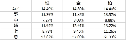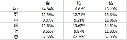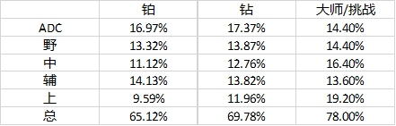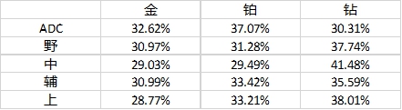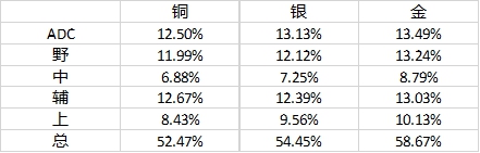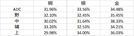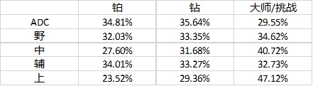 和前面的横向数据对比可以看到随着比赛质量的提升,玩家选择位置也趋于固定。这个趋势到了职业比赛达到极致,每人基本只能玩一个位置。所以路人rank中补位不是不可以,但是只要有可能还是应该争取自己最擅长的位置,这才是上分正道。