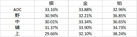 总体来说和前一个表格表达的信息比较接近。尽管上到黄金的玩家胜率看上去不高,但由于我没有在他们上黄金的那一刻就截图,他们的胜率会受到高段位玩家的打压,因此会低于上段实际需要达到的胜率。粗略计算一下,如果不考虑跳级,每升一小段需要的胜负差大约在6-7场,那么比如从白银五到黄金五就需要多赢30-35场。如果你的胜率在55%左右,那么在途中胜率不降的前提下大概需要300场(165胜135负),而想要在100场内搞定就需要65%的胜率(65胜35负)。各位可根据这个模型自行估算。