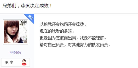 而在赛后,5月8日凌晨。HGT贴吧吧主发帖称“兄弟们,态度决定成败!”,引起了玩家们的一片热议。而这类似的帖子本来没什么,关键吧主是Air的女友,这下玩家们可炸了锅了。帖子具体内容见下:
