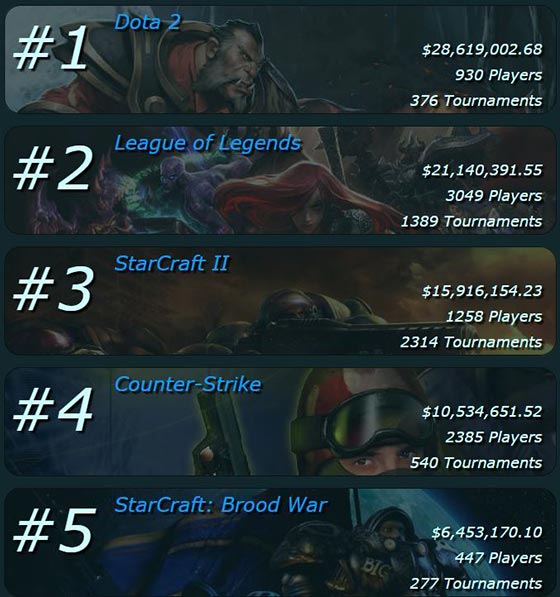 依照外国eSports Earnings网站的奖金统计,目前累积奖金高达强五名的项目有《DOTA2》、《英雄联盟》、《星际争霸2》、《CS》、《星际争霸:怒火燎原》,其中比赛总奖金最高的《DOTA2》甚至达到2800万美元的惊人数目,远远超过其他电子竞技项目。
