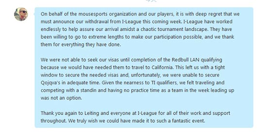 在不久前我们得到最新消息,更名为Mouz的TeamTinker战队由于签证问题将无奈放弃i联赛线下赛的征程。这样,之前备受大家期待的Black来华“复仇”之战成为遗憾。