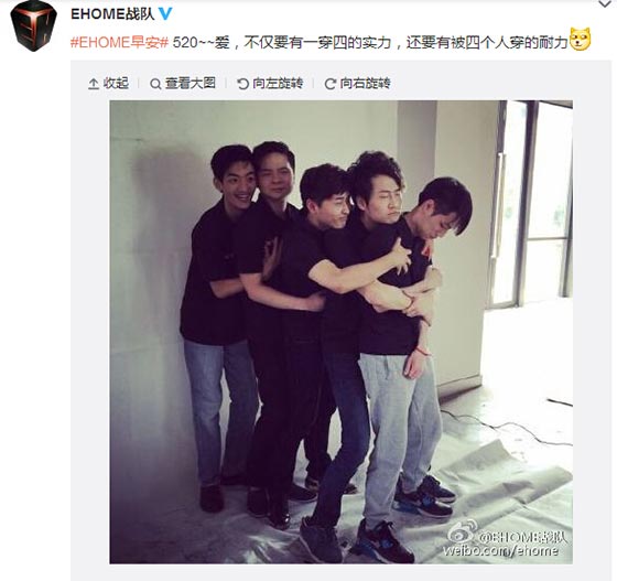 今天是5月20日,传说中的“网络表白日”。就在大家苦思冥想着如何向心仪的另一半表白爱意时,Ehome官博放出一张全队“激情照”,图中5人紧紧抱在一起,很是“恩爱”。