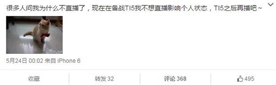 晚些时候,ChuaN跟进了另一条微博,简单的表示为了备战TI5,将不再进行直播。玩家们对于ChuaN的连番表态颇为认可,也希望iG能够尽快找回状态。如果真的队伍内部有矛盾,更应该无视外界干扰,早日冰释前嫌。
