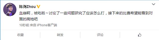 赛后,zhou在微博称,“血崩被吃啦!讨论了一些问题,研究了应该怎么打。接下来的比赛希望能看到对面的高地吧。”
