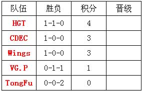 A组方面,今天进行的比赛相对较少,HGT、VG.P与TongFu各自完成了两场比赛,CDEC、Wings仅完成了一场比赛,所以这个小组的出线形势仍未明朗。
