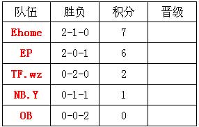 与A组相比,B组的出线形势已经明朗了不少,EHOME与EP分别以7分和6分的成绩排名前两位。在明天的比赛中,EHOME将要迎来NB.Y的挑战,只要能够保证不败,EHOME就将确保晋级淘汰赛。即便输掉了比赛,凭借着较大的领先优势,EHOME想要出线也并不是一件难事。